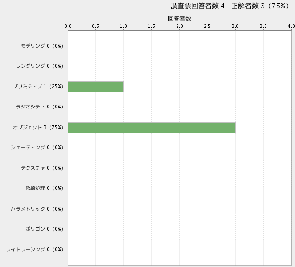 | [Q44] 調査票回答者数 4 / 正解者数 3(75%) 一般に情報処理の世界でひとまとまりとしてデータを表し、図形処理の世界ではひとまとまりの図形を表す。情報処理の対象は「手続き(プログラム)」と「データ」分けられ、古くは手続きこそが重要とされたが、現在はデータ自体がどのように扱われるべきかこそがデータの付属物とであると言う考え方「【 】指向」が主流となった。CADも昔、コマンドを指定してから図形を操作する類だったが、図形を先に選択し、どう操作するかを選ぶシステムへと進化し、図形が【 】として扱われるようになった。 (正解:オブジェクト)