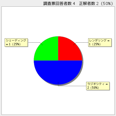 | [Q40] 調査票回答者数 4 / 正解者数 2(50%) 3次元グラフィックスで、物体の座標データや光源や視点の位置などの環境に関するデータを計算して画像を描画する手法の一つで、次のことをなんと呼ぶか? 「照明工学の分野において発達した手法をコンピュータグラフィックスに応用したもの。光の相互反射を利用し、物体の各面の相互の反射を厳密に計算することにより、各面の持つ光のエネルギーを算出する。柔らかな間接光の効果を表現できるのが特徴だが、相互作用を収束計算するため、膨大な計算量が必要である。」 (正解:ラジオシティ)